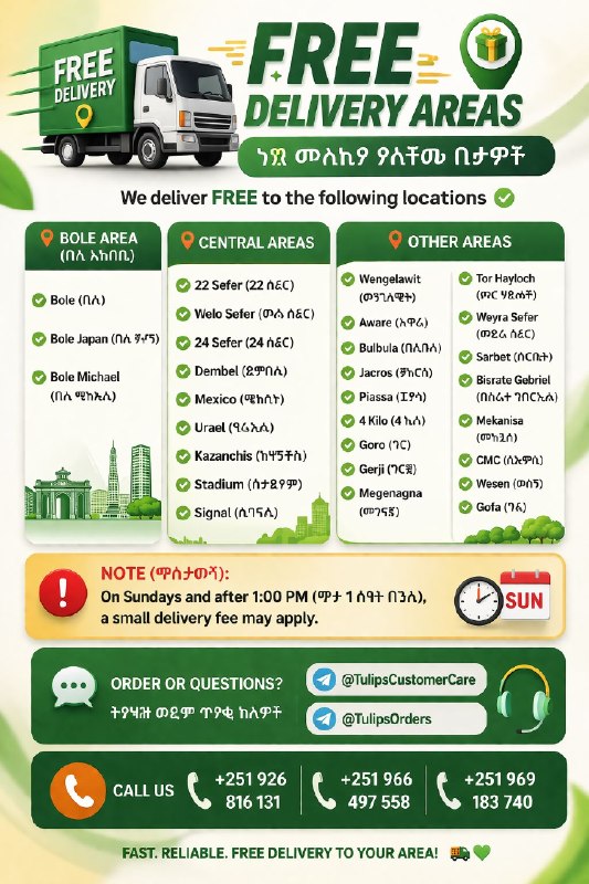 🚚✨ FREE DELIVERY AREAS (ነጻ መላኪያ) ✨🚚 We deliver FREE to the following locations 👇 📍 Bole Area (ቦሌ አካባቢ) • Bole Japan (ቦሌ ጃፓን) • Bole Michael (ቦሌ ሚካኤል) 📍 • 22 Sefer (22 ሰፈር) • Welo Sefer (ወሎ ሰፈር) • 24 Sefer (24 ሰፈር) • Dembel (ደምበል) • Mexico (ሜክሲኮ) • Urael (ዑራኤል) • Kazanchis (ካዛንቺስ) • Stadium (ስታድየም) • Signal (ሲግናል) 📍 • Wengelawit (ወንጌላዊት) • Aware (አዋሬ) • Bulbula (ቡልቡላ) • Jacros (ጃክሮስ) • Piassa (ፒያሳ) • 4 Kilo (4 ኪሎ) • Goro (ጎሮ) • Gerji (ገርጂ) • Megenagna (መገናኛ) • Tor Hayloch (ጦር ሃይሎች) • Weyra Sefer (ወይራ ሰፈር) • Sarbet (ሳርቤት) • Bisrate Gebriel (ብስራተ ገብርኤል) • Mekanisa (መካኒሳ) • CMC (ሲኤምሲ) • Wesen (ወሰን) • Gofa (ጎፋ) 🔴 Note (ማስታወሻ): On Sundays and after 1:00 PM (ማታ 1 ሰዓት በኋላ), a small delivery fee may apply. --- 📩 Order or Questions? 👉 @TulipsCustomerCare 👉 @TulipsOrders 📞 Call Us: +251 926 816 131 +251 966 497 558 +251 969 183 740