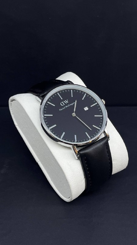 Black dial, black case, and black leather strap.